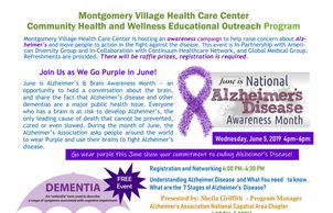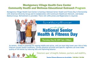 Montgomery Village Health Care Center is hosting a National Senior Health and Fitness Day In-Partnership with American Diversity Group and In-Collaboration with Continuum Healthcare Network, and Global Medical Group. Refreshments are provided. There will be raffle prizes; registration required.