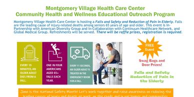 Montgomery Village Health Care Center is hosting a Falls and Safety and Reduction of Pain in Elderly. Falls are the leading cause of injury-related deaths among seniors 65 years of age and older. This event is In-Partnership with American Diversity Group and In-Collaboration with Continuum Healthcare Network, and Global Medical Group. Refreshments will be served. There will be raffle prizes, registration is required.