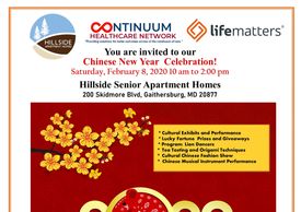 Join us in celebrating the most important festival in the Chinese Calendar -Chinese New Year!- Hillside Senior Apartments of Gaithersburg, MD is hosting a weekend of activities and entertainment in honor of our special guests from the Chinese Culture and Community Service Center. Inc (CCACC), Asian American Chamber of Commerce, Montgomery Village Seniors Association, and City of Gaithersburg Senior Association. There will be lots of food, Chinese cultural performances, and entertainment. Also there will be "FREE HEALTHCARE SCREENING", Senior Service Providers and Senior Resource Agencies.
